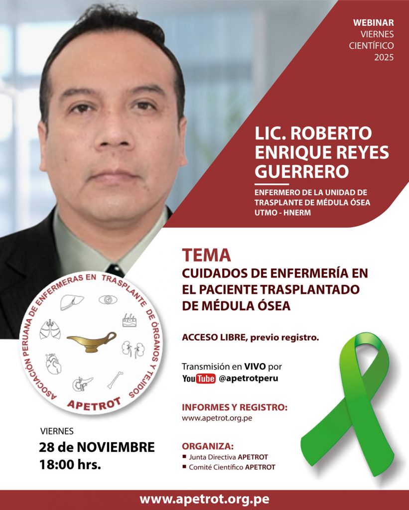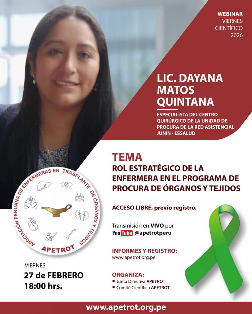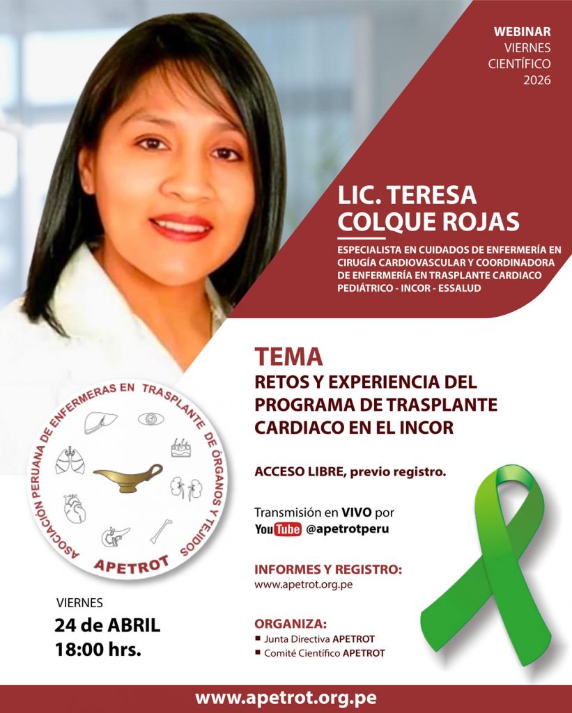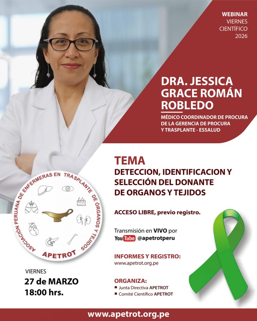 Estimados colegas, es un grato honor dirigirme a ustedes como Presidenta de la Asociación Peruana de Enfermeras en Trasplante de Órganos y Tejidos – APETROT, una asociación que desde su creación tiene por finalidad fortalecer y perfeccionar el proceso de atención de los y las enfermeras en cada una de las etapas del trasplante de órganos y tejidos, basado en competencias acordes a los avances científicos y tecnológicos.